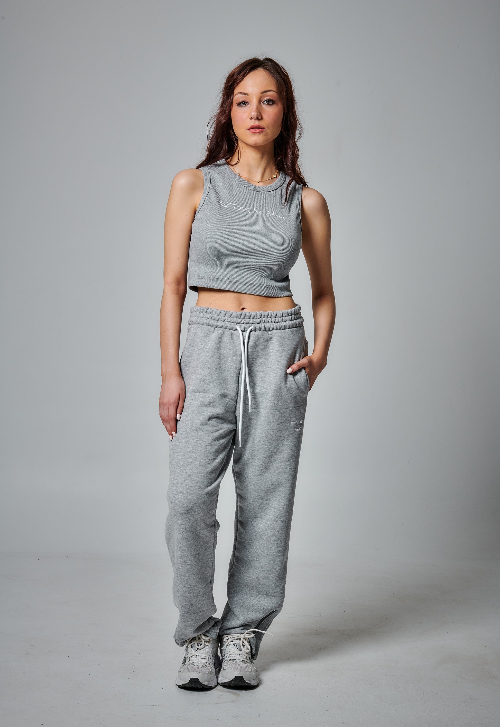 Αμάνικο γκρι cropped top "Ασ' τους να λένε", από ελαστικό ύφασμα με rib ύφανση, στρογγυλή λαιμόκοψη και κέντημα μπροστά και πίσω.